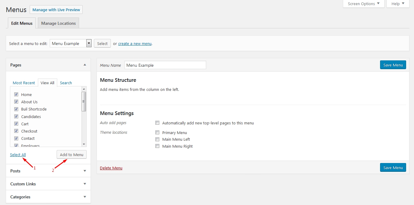 1. From the 'Appearance' menu on the left-hand side of the Dashboard, select the 'Menus' option to bring up the Menu Editor.
